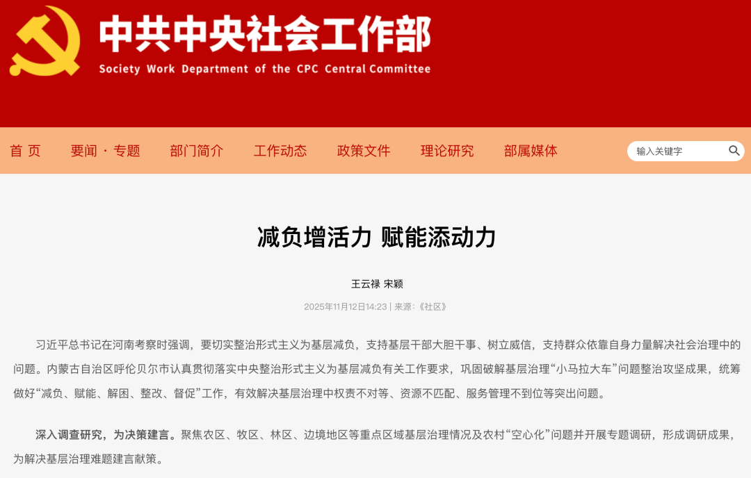 习近平总书记在河南考察时强调,要切实整治形式主义为基层减负,支持基层干部大胆干事、树立威信,支持群众依靠自身力量解决社会治理中的问题。内蒙古自治区呼伦贝尔市认真贯彻落实中央整治形式主义为基层减负有关工作要求,巩固破解基层治理“小马拉大车”问题整治攻坚成果,统筹做好“减负、赋能、解困、整改、督促”工作,有效解决基层治理中权责不对等、资源不匹配、服务管理不到位等突出问题。
